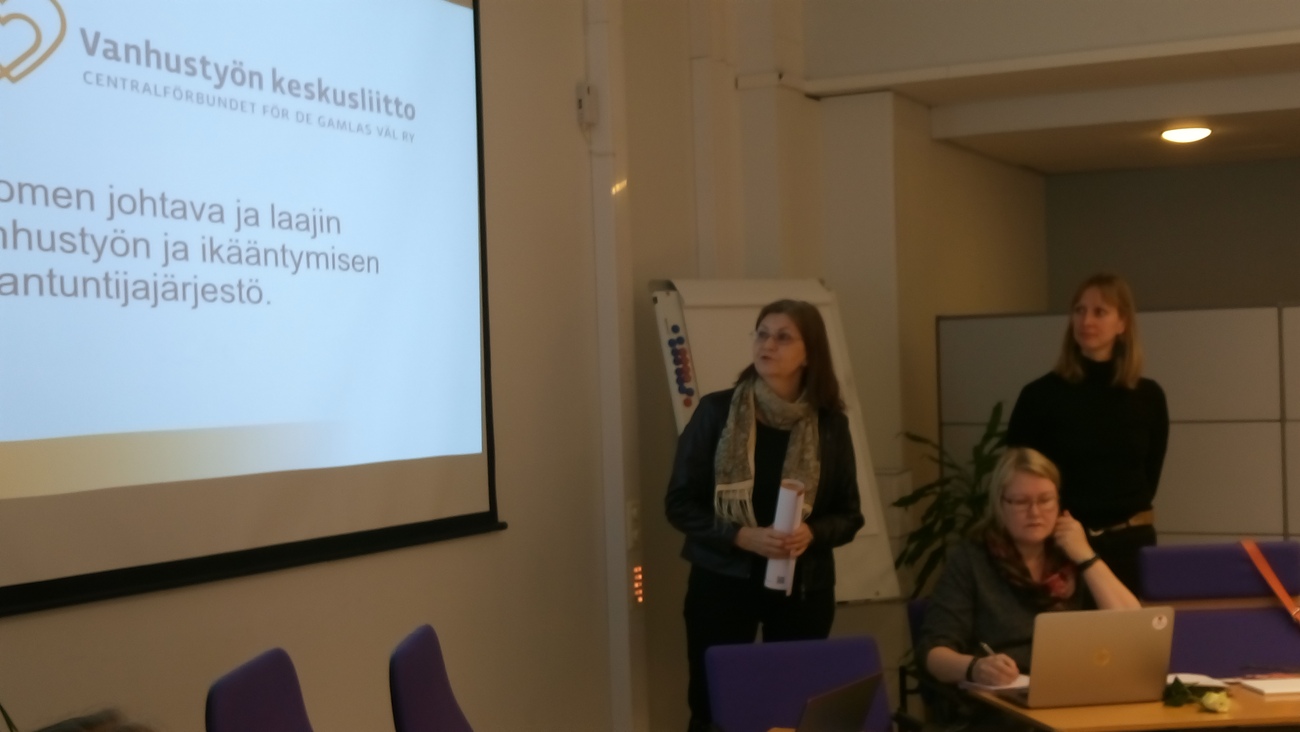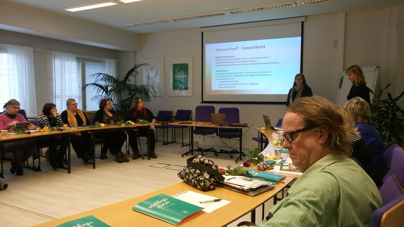 Päivän teemana oli Joka mummi ja vaari nettiin. Kuultiin lyhyet esittelyt kaikista mukana olevista yhdistyksistä. Reumaliiton järjestötoimen johtaja Ulla Rantanen avasi tilaisuuden ja kertoi kuinka tärkeä hanke tämä meille on. Satu infosi pilottihankkeesta ja perusteista, miksi ikäihmisten tulisi olla netissä ja omata tietokoneen tai tabletinkäytön perustiedot. Päivän aikana todettiin, että kaikki eivät koskaan voi oppia käyttämään nettiä, mutta tässä tavoitellaan nyt niitä, ketkä voivat: "slow go" -porukkaa, joka hyötyy taidoista myös sitten, kun/jos toimintakyky vielä heikkenee. Vanhustyön keskusliitosta oli mukana SeniorSurf hankkeesta vastaava Liisa Tiainen ja Enter ry:n toiminnanjohtaja Tiina Etelämäki, jotka kertoivat SeniorSurf-hankkeesta tulleista kokemuksista. Kirkkopalveluiden Annmari Salmela kertoi Vapaaehtoistyö.fi sivustosta, jonne laitetaan nyt ilmoitukset kaikista paikkakunnista, ketkä hakevat nettiopastajia. Reumaliiton yhteyssihteeri Ritva Saukonpää kertoi Siviksestä, josta voidaan hakea rahoitusta nettikursseille. Mukava päivä kaikenkaikkiaan ja toivottavasti kaikki palasivat koteihinsa innoissaan aloittelemaan nettiopastustoimintaa omalla paikkakunnallaan.